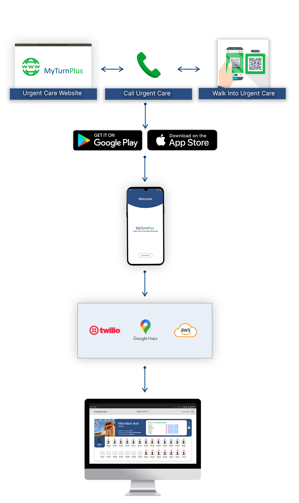 Unlike typical queuing applications the MTP™ logic & architecture is specific to urgent care clinics and its patients. The MTP™ A/I and machine learning technology was developed specific to urgent care clinic data points.